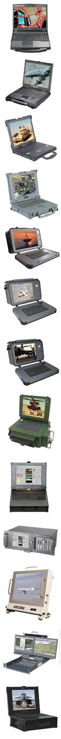 Available is a full range of ruggedized and militarized notebook computers with bright and sunlight-readable 13.3, 14.1 and 15.0-inch displays. Depending on the application, select the Getac P475M Trooper multi-purpose notebook with built-in 3G communication, the Getac B305M with a super-bright LCD and 12-hour operation, the Getac M235M with its 1400 x 1050 accelerated display, or the Getac A795M that accommodates two PCI or PCIe cards.