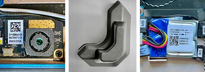 And more details below: On the left a look at the tablet's 8-megapixel rear camera and LED flash next to it. It's amazing how very tiny those have become. In the middle one of the screw-on protective corner bumpers, and on the right the small backup battery that allows just enough uninterrupted running time to pop in a replacement main battery.