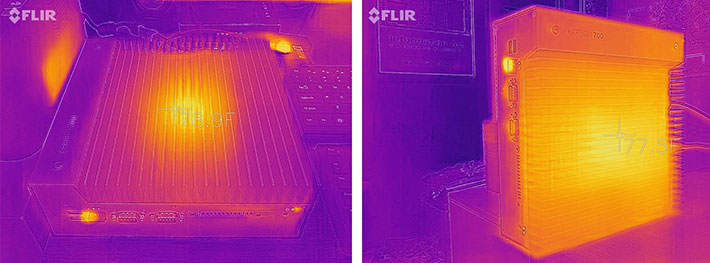 OnLogic says that every component has been thermally optimized to provide reliable wide operating temperature operation, and the chassis is thermally designed to perform in whatever situation it finds itself in, from deserts to glaciers. Below a couple of thermal imaging views of the Karbon 700 while running a benchmark suite, taken with our FLIR One Pro camera.