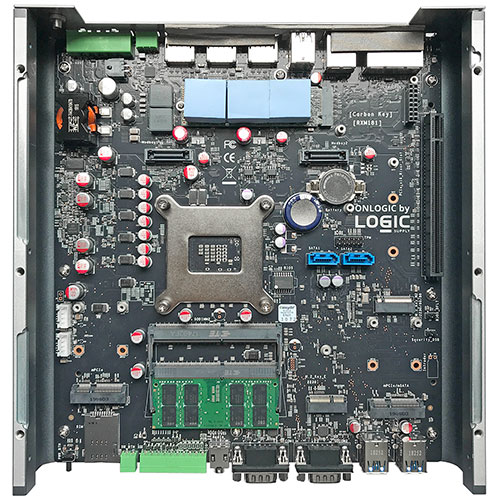The housing consists, as is usually the case with such industrial Box PCs, of steel plates and massive aluminum heat sinks with prominent finning. Open a few Torx 10 screws, and one of the Karbon 700 easily comes apart off, opening access to the top of the 8-1/2 x 9-1/4 inch motherboard.