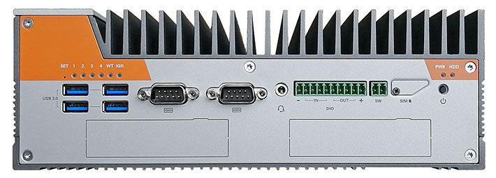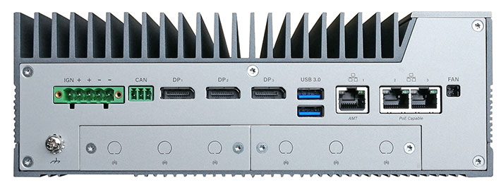 Rear I/O: 5-pin power (9 ~ 48 V), 1 x CAN bus, 3 x DisplayPort, 2 x USB 3.1, 3 x GbE LAN (2 PoE optional), 2 x ModBay (4 LAN, 4 PoE, etc.)
