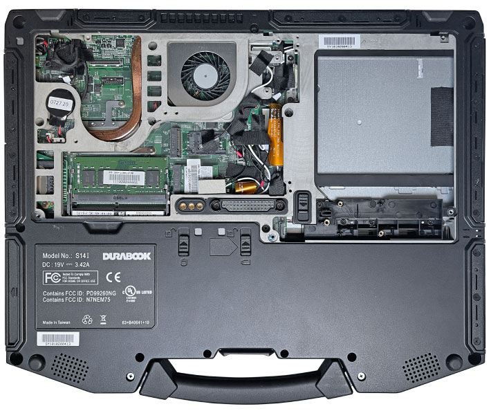 Below you can see how the DURABOOK S14I provides easy access to its interior via a large removable bottom plate that is held in place by just three small screws. Once removed, you can see what sits underneath: storage, RAM, WWAN, WLAN, GPS, CPU, and room for an optional small bridge battery. All modules are easily recognizable and easily replaceable. Note that the cover has a couple of ventilation slots where liquids can get in. Remember, this is a spill-resistant laptop, but not a fully sealed one.