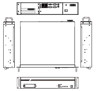 Winmate's IV7 rack server is designed as a flexible solution for a wide variety of industrial applications. The server is implemented in "2U" format where "U" refers to the 1.75-inch height of a "rack unit." A 2U module is therefore 3.75 inches tall. The diagram below shows the Winmate IV7T from the top and all four sides.