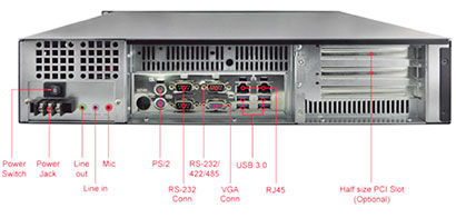 Winmate's goal here was to provide a simple, straightforward fanless electroplated steel rack mount design that provides roughly the computing performance of a high-end notebook computer, but considerably more I/O and configuration options. The image below shows the backside of the IV7 rack-mount server.