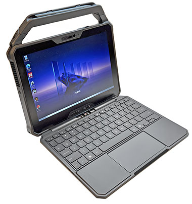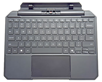 The keyboard is designed specifically for the Pro Rugged 10 tablet, which snaps into the hinged base so that the combination functions like a laptop in every respect. Unlike some similar solutions, the Dell keyboard is not a port replicator. It is simply a keyboard — albeit a very solid, very high-quality one. On its own, it weighs 1.8 pounds and even includes backlighting. Used together with the optional carry handle, the Pro Rugged 10 can easily be taken anywhere. It works just like a laptop when needed, or it can be detached and used as a light, handy tablet.