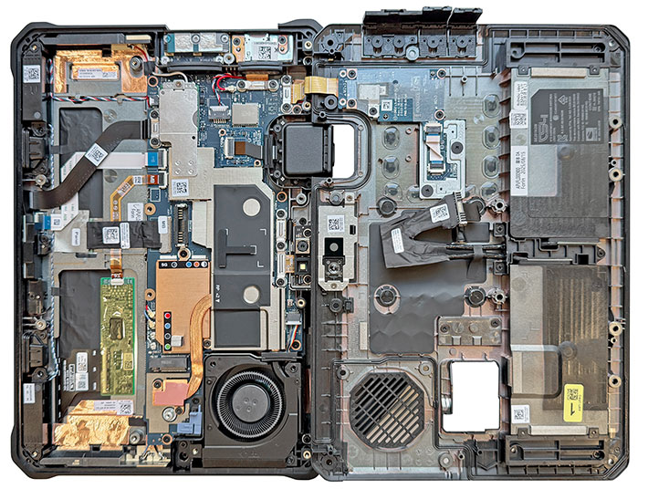 Rugged Windows tablets are very different inside from iPads or Android devices. In the latter devices' interiors, most of the space is taken up by a big, flat battery and some tiny, hyper-integrated electronics. Windows tablets, on the other hand, still look much like laptops inside. Which is what you'd expect, since a tablet is basically a full PC squeezed into a slender, compact box, something Dell has great experience in. Electronics are getting ever more miniaturized and integrated, but modern tablets like the Dell Pro Rugged 10 it still looks like a PC with lots of wires, connectors, components and modules.