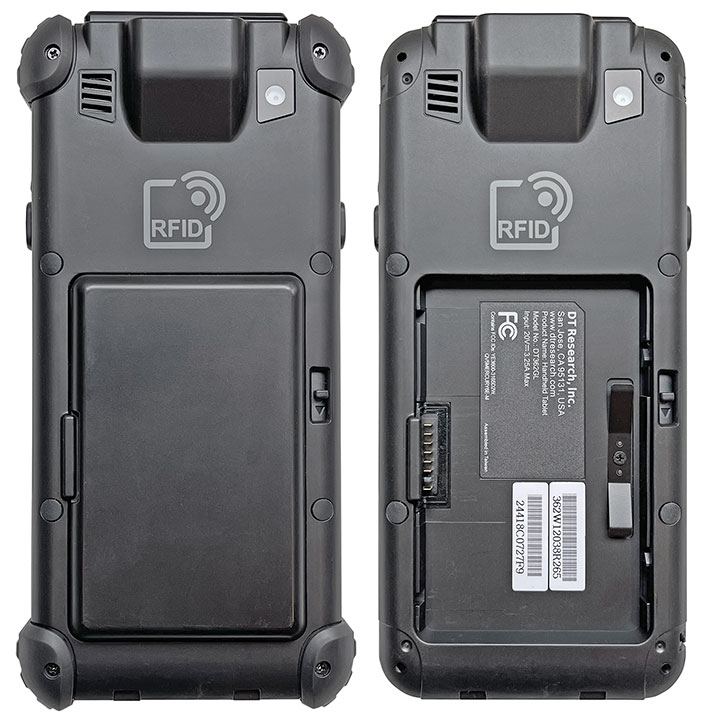 DTR offers the DT362GL with an integrated long range UHF RFID scanner. Unlike barcodes, RFID — Radio Frequency IDentification — doesn't rely on line-of-sight scanning, RFID is faster, and RFID tags can be scanned over longer distances. Barcodes, on the other hand, are cheaper, are much more widely used, and the logistics of using barcodes are simpler. DT Research offers both as options for the DT362GL, and the UHF RFID reader certainly attracts attention.