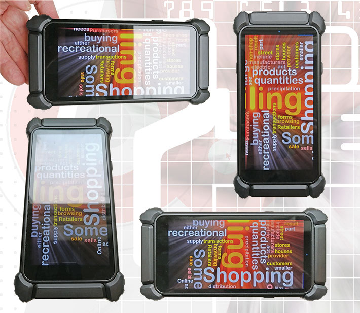 As all DT Research devices, it is also beautiful. Skillful use of glass, metal, rubber and plastics merges into a design that exudes a functional elegance which puts today's slim, fashion-first smartphones to shame. Below is a look at the DT362GL handheld tablet from the front and from all four sides. While the front looks much like a smartphone with extra padding and protection, the side views show that this is a serious and purposefully designed 24/7 tool for the job.