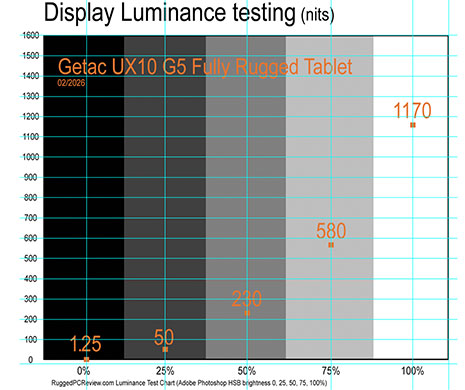 The 10.1-inch IPS display (as used across recent Getac platforms) offers 1920 x 1200 pixel resolution, resulting in a sharp 224 pixels per inch. Rated at 1,000 nits of luminance — and measuring nearly 1,200 nits in our testing — the screen remains clearly viewable even in bright outdoor conditions, which has effectively become the standard for this class of rugged tablets. The display supports 10-point capacitive multi-touch, includes a hard-tip stylus, and is available with an optional active digitizer.