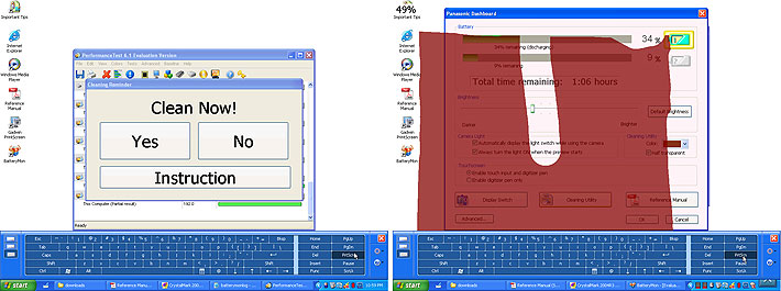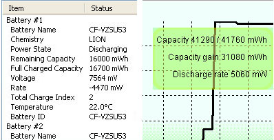 The image to the right shows battery information both from Panasonic's included utility as well as from the BatteryMon benchmark. Both shows discharge rates as low as four to five watts. Do the math: with a battery capacity of 42 watt-hours and an idle draw of four to five watts, the battery will last about nine hours. That's for idling along. If the computer is used to do work, power draw rises and battery life drops.
