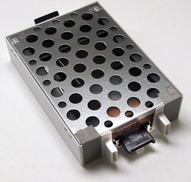 The disk is sitting in its own and completely separate white plastic caddy (shown in the picture to the right). Inside the case, the hard disk is cushioned by a special type of slow-collapsing foam that Panasonic developed especially for this very purpose. In a typical three foot drop, the impact on the disk is reduced from 1,500Gs to just 250G -- only half of the Toshiba MK8017GSG hard disk's rated 500G maximum while operating! That is impressive.