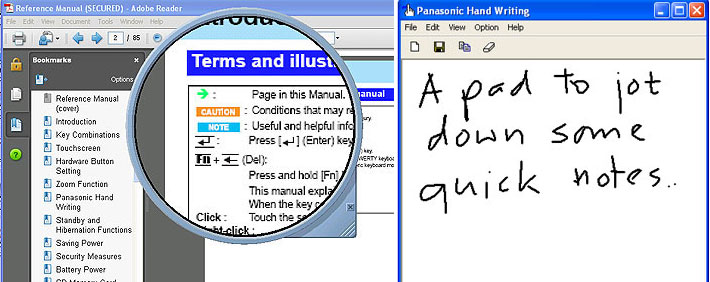 The Panasonic Hand Writing utility brings up a handy pad where you can quickly jot down some handwritten notes. Since the H1 has full Tablet PC functionality, you can, of course, use the much more sophisticated Windows Journal for handwritten notes. Below you can see the loupe and the handwriting pad:
