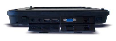 On the tech spec side, the Sahara TufTab i310XT runs on a 1GHz ultra low voltage Intel Celeron, comes with shock-mounted disks ranging from a 5400rpm 60GB drive to a large and speedy 160GB 7200rpm unit, and features a 12.1 in. wide angle screen with the currently popular 1280 x 800 (16:10) aspect ratio. The unit has a 4-wire analog touch screen, which means you can't run the Tabet PC Edition on it. There is 802.11 b/g wireless LAN, Bluetooth 2.0, a PCMCIA Type II slot for expansion (plus a Lexard SD card reader) and a biometric fingerprint reader for added security. You can operate the i1310XT by fingertip or with a stylus and it also has a handy on-screen keyboard, making it possible to type directly on the screen in the familiar QWERTY layout without having to use an optionally available external USB or Bluetooth keyboard.