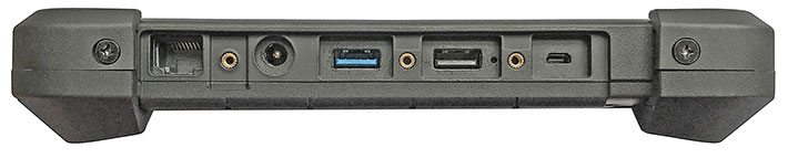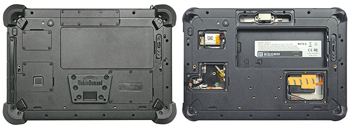One look at the xTablet T1150 and you know this is a rugged design from the ground up, and not something retrofitted for extra duty. Its designers skillfully combined the contemporary tablet look with the functionality and features required of a rugged tablet. While consumer smartphones and tablets increasingly have displays taking up the entire front of a device, that makes them damage-prone and such displays really aren't very practical. So the T1150 has a nice margin around the actual display that's large enough to a) allow for a flush front glass surface for easy touch operation, and b) allows for easy holding of the tablet without blocking part of the LCD. The actual LCD is recessed just a bit from the housing bezel, just enough for MobileDemand to apply a fairly thick screen protector. No "Mobile Demand" branding here, though they may still add their traditional orange logo to final shipping versions.