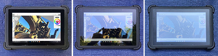 There are several specs where the three levels are close or the same. All have displays measuring 10.1 inches diagonally. The lower two sport 1280 x 800 pixel resolution, but the new T1150 shines with 1920 x 1200. All are capacitive multi-touch. One notable difference is display luminance (brightness), which is quite important for outdoor use.