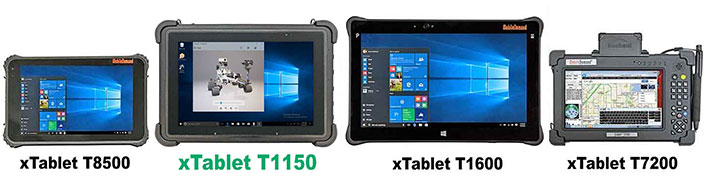 The lineup below provides a quick look at how the new xTablet T1150 visually compares to some other MobileDemand products. From left to right, the 8-inch class T8500 (since been replaced by the similar T8540), the new 10.1-inch T1150, then the higher-end 11.6-inch T1600, and on the right the older fully rugged 7-inch T7200 with integrated keypad.
