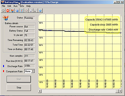 We used BatteryMon to measure power consumption. The discharge rate with wireless off and the backlight set at 50% was about 13.5 watts. The estimated battery life is therefore between 3.5 and 4.0 hours. Real world battery life, of course, varies and is based on how the machine is used. This result does not fit in. Prior BatteryMon benchmark testing with Atom-powered devices showed discharge rates of about 7.5 watts for N270-based systems (like the Acer Aspire One) and about 6.5 watts for a Z540-powered device like the Panasonic H1. We have no doubt that the IA80 can draw power at those low rates, and so our pre-production model may not have been properly configured for the optimal power draw yet.